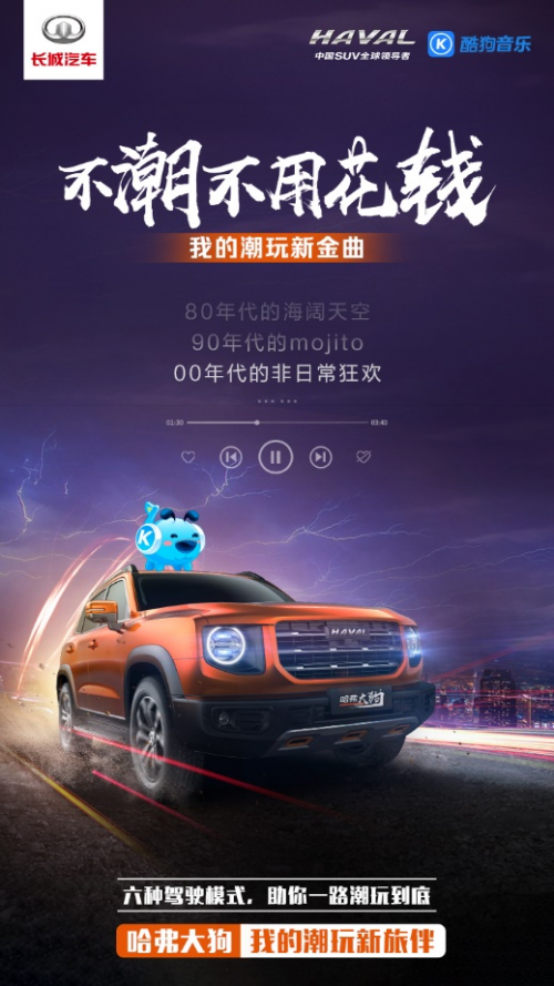 无论走在互联网潮流音乐尖 端的酷狗音乐,还是引领潮流风向的虎扑,或是智能手机时代极受欢迎的搜狗输入法,都开始着力于潮流文化的发掘,而拥有年轻品牌基因的哈弗大狗,同样洞悉到用户需求的转变,并持续输出潮流生活方式,以硬核实力带领年轻用户潮玩出彩。潮流跨界永不停歇,这个7月,哈弗大狗与你一路潮前!